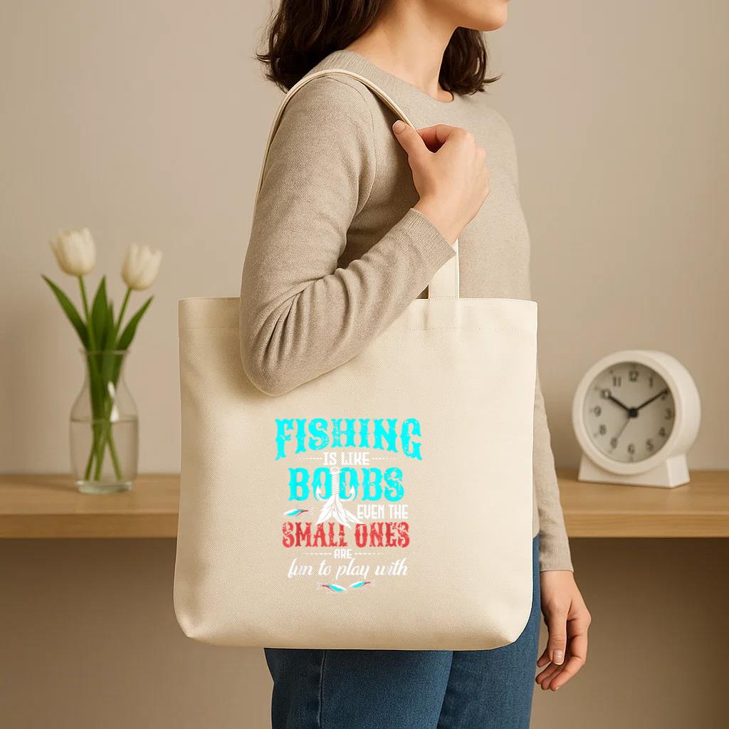 Chic, durable, and reusable , this Fishing Like Boobs Small Ones Are Fun To Play Canvas Tote Bag Canvas Tote Bag is your daily go-to or a thoughtful gift for any occasion.